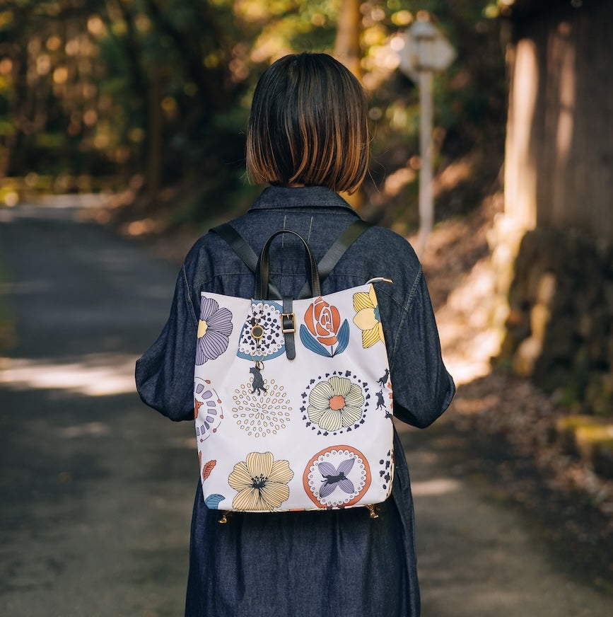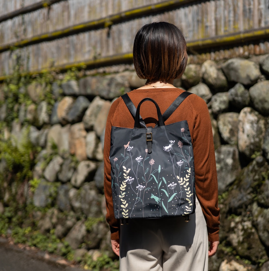 aonecoオリジナルのテキスタイルを使用した鞄に立体的な底鋲付き。こっそりネコ要素を詰め込んだ、ネコ足シリーズです。