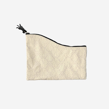 そんなポーチをaonecoオリジナルのダマスク柄キャンバス生地で仕立て、引き手部分にはあお向けネコがぶら下がります。